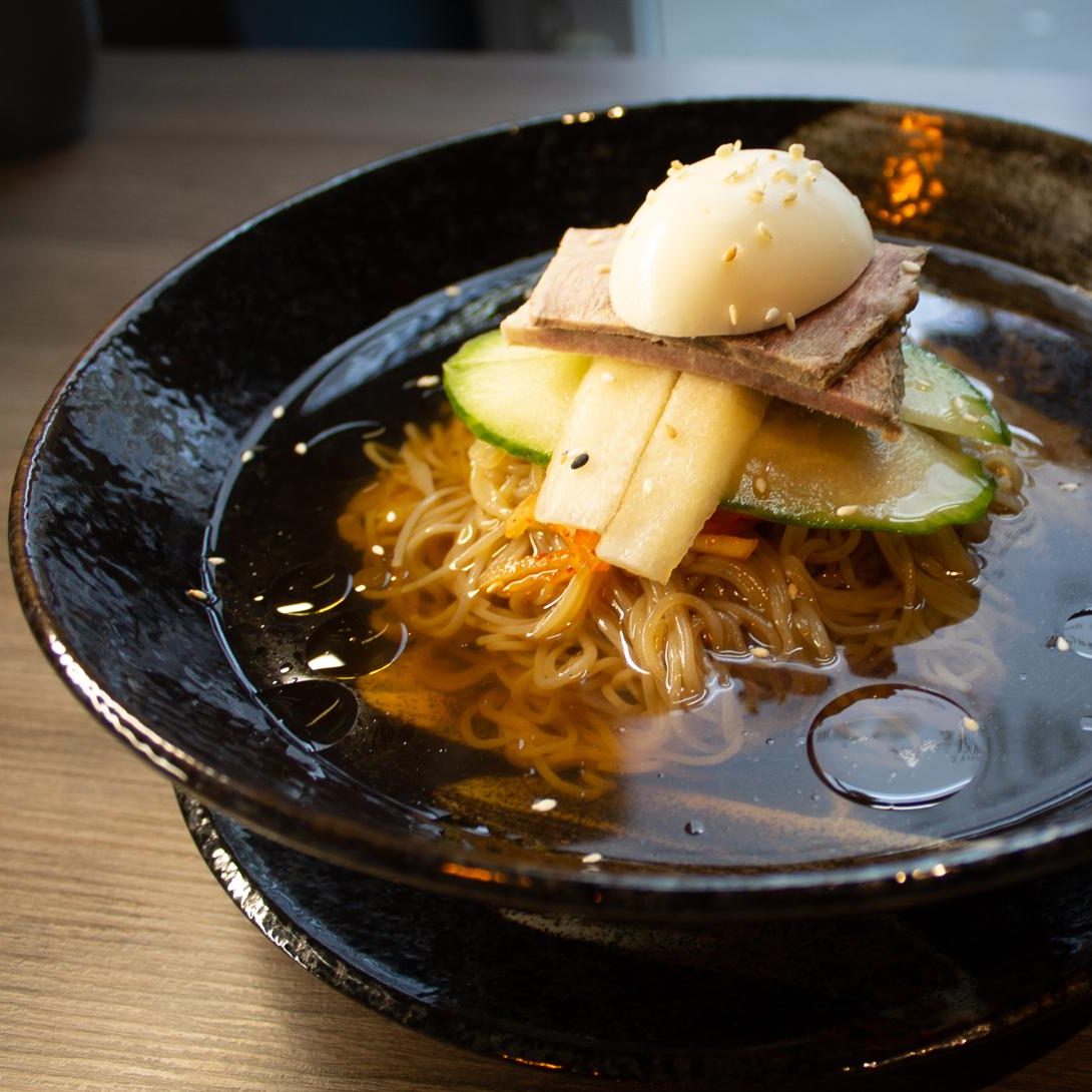 Eine kalte Nudelsuppe mit Ei, Rindfleisch und Gemüse