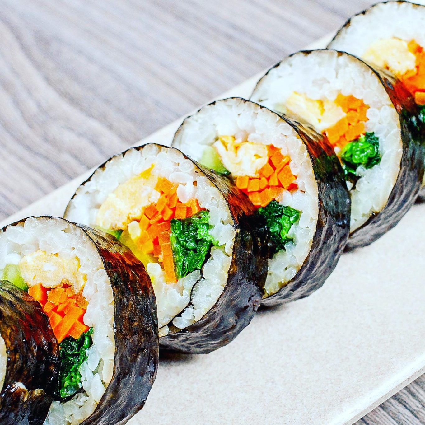 Frische Kimbap-Rollen: Herzhaft gefüllt mit Gemüse und wahlweise Ei, Rind oder Thunfisch.